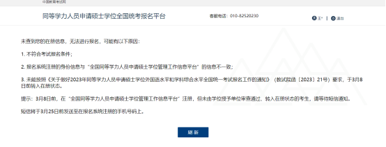 7.对于报名出现下述提示的,请按照页面提示核对同等学力信息平台上的信息是否与报名系统注册的信息一致。对于开云体育 2022级同等学力学员还不能完成报名的需要等待处理短信通知,短信将于3月25日前发送至注册手机上,请届时留意。