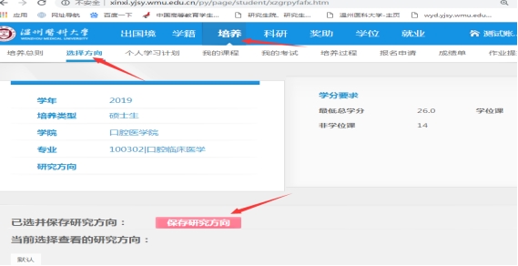 (1)选择培养方案研究方向:学生需要先选择研究方向,才能进入后续的个人学习计划制定的工作。流程:点击培养---选择方向---选择研究方向(此处研究方向的选择与开设课程关联,不会影响实际科研研究方向,大部分专业此处方向为默认,选择“默认”。