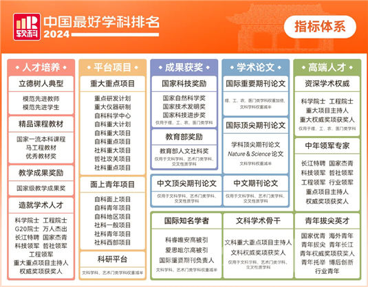 据悉,软科中国最好学科排名的指标体系包括人才培养、平台项目、成果获奖、学术论文、高端人才5个指标类别,下设18个指标,共计70余项反映学科竞争力的观测变量。排名数据全部来自第三方数据源,如教育部、科技部、国家自然科学基金委员会、国际和国内文献数据库等。学科排名全国前3%(或前2名)为“中国顶尖学科”,位列全国前7%(或前3名)和前12%(或前4名)为“中国一流学科”。