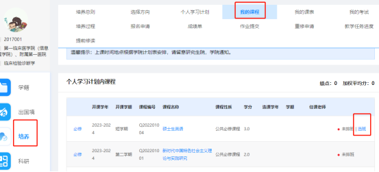 2、操作步骤:点击培养--我的课程,针对开课学年为“2023-2024学年第二学期”的课程,点击“选班”!根据上课时间地点选中上课班级。