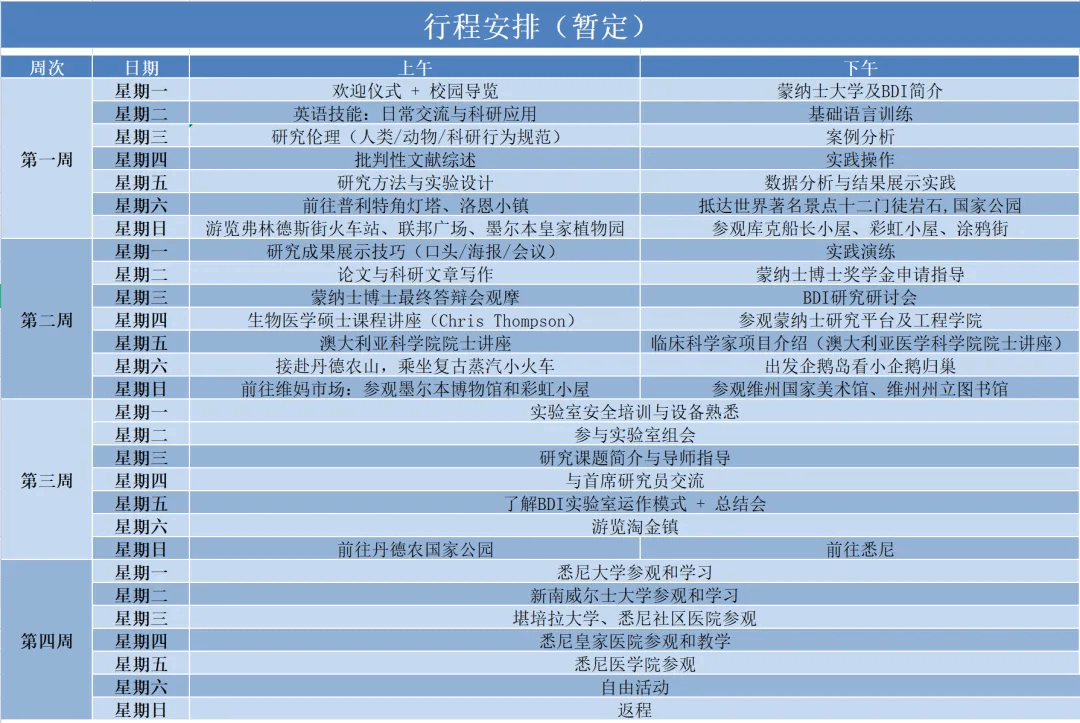 (一)项目内容:莫纳什大学为开云体育 学生开设医学课程,包括医学讲座、医学英语学习、医疗机构学习、学生文化交流等内容,有助于拓宽学生国际视野,提升交流能力,进一步了解澳洲教育、文化、医疗体制等。