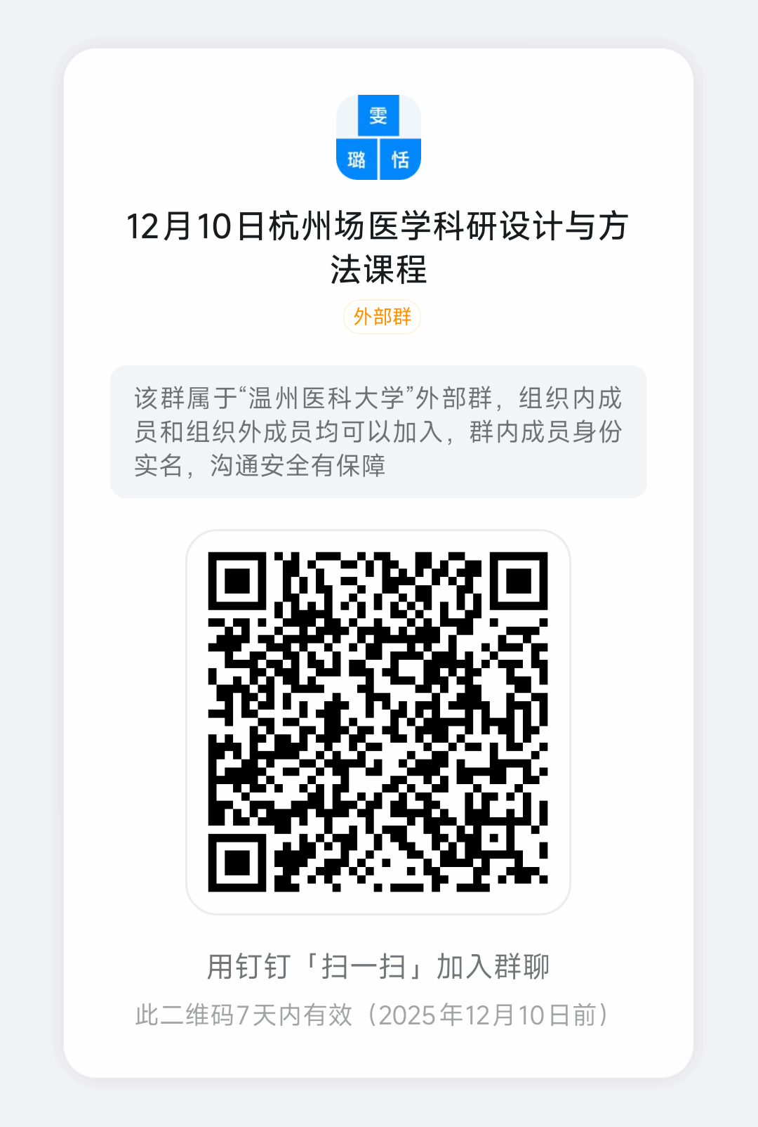 《医学科研设计与方法》课程将于12月10日(周三)上课,本次课程地点为:研究生培养基地浙江省人民医院朝晖院区(浙江省杭州市拱墅区上塘路158号)。请参加会议的同学提前十分钟签到入场(需提前扫描下方二维码报名,报名截止日期为12月7日22:00),具体安排如下: